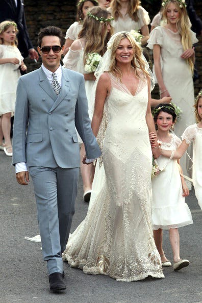 Wild child and ubermodel Kate Moss and guitarist for The Kills Jamie Hince tied the knot at St Peter's Church in Little Faringdon in the Cotswolds, England. Kate donned a cream-colored, vintage-inspired dress made by disgraced designer John Galliano and her hair was styled by Sam McKnight. For the ceremony, Jamie selected a light blue Stefano Pilati for YSL suit. Following their wedding at a village church, the bride and groom happily posed outside with the supermodel's 15 bridesmaids, including her eight-year-old daughter Lila Grace. After the photo session, the couple got into a Rolls Royce and headed to Moss' mansion for first day of a three-day reception.