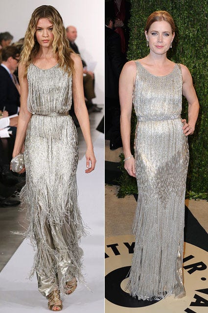 A model wears a shimmery design from the Oscar de la Renta Pre-Fall 2013 collection runway show, which Oscar nominee Amy Adams rocked to the 2013 Vanity Fair Oscar Party.