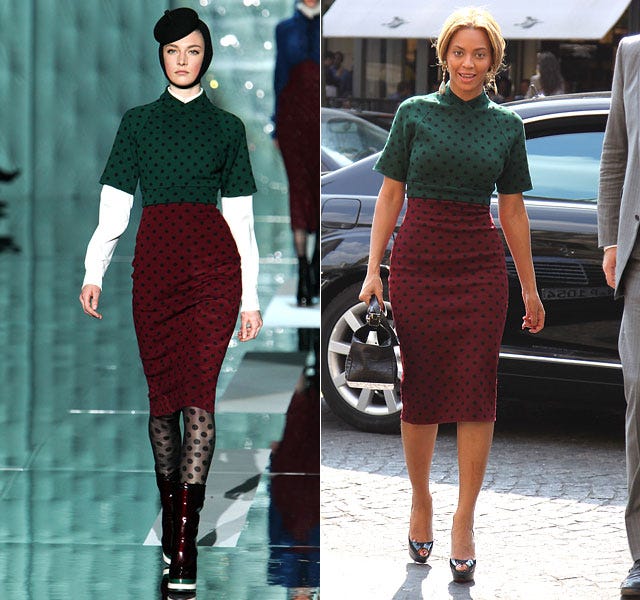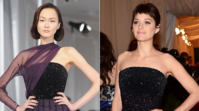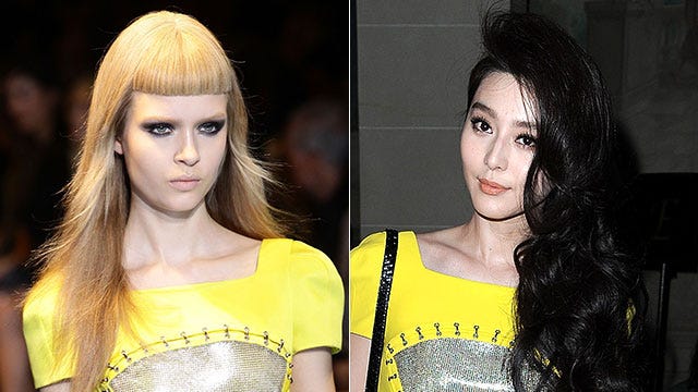 It's a fashion battle for the ages! Celebs love to don looks straight off the runway. But do they rock those looks? You get to decide! Are you feelin' the designer's head-to-toe catwalk creation or do you dig how these style-conscious celebs interpreted the runway style? Cast your vote! First up, a model walks the runway at Versace fashion show during Milan Womenswear Fashion Week on February 24, 2012 in Milan, Italy. Similarly, Chinese star and international fashionista Fan Bingbing wears the Versace design to the Versace Haute-Couture show during Paris Fashion Week on July 1, 2012. Which yellow design is the most sublime?