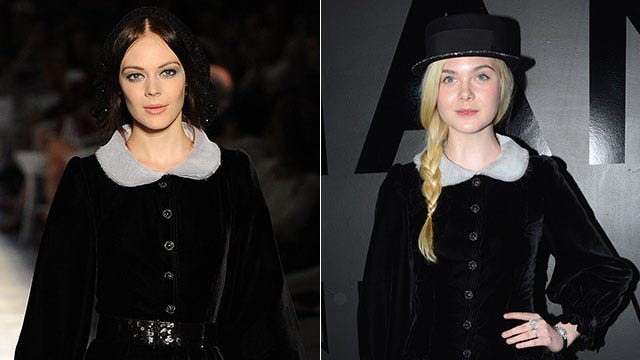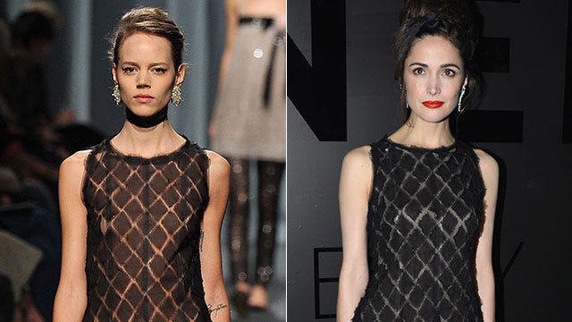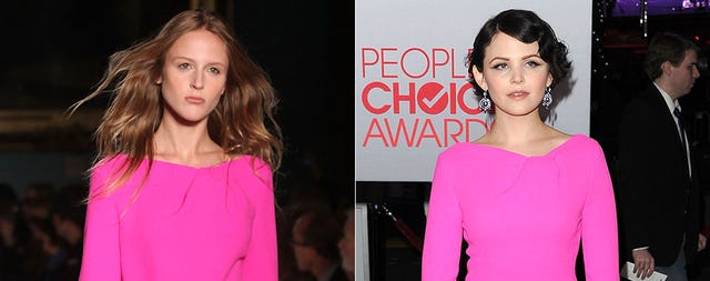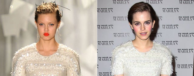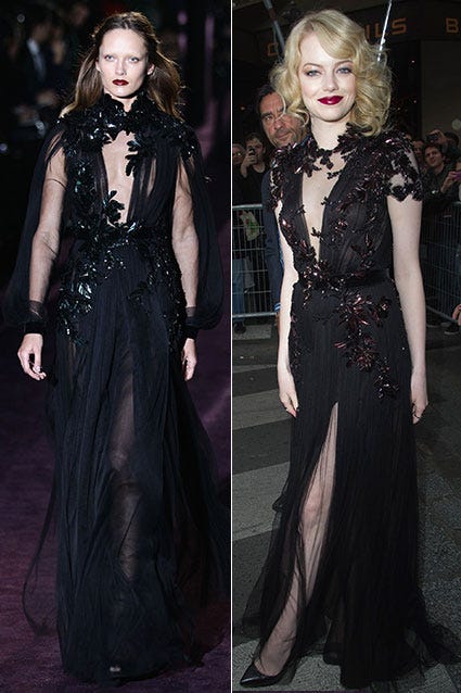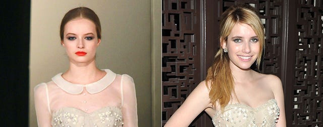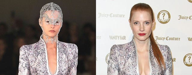 A model struts her stuff down the runway during the Alexander McQueen Ready to Wear Spring/Summer 2012 show during Paris Fashion Week on October 4, 2011 in Paris, France. The Help's Jessica Chastain poses in the same style at the Vanity Fair and Juicy Couture Vanities 20th Anniversary party on February 20, 2012 in Hollywood, CA.