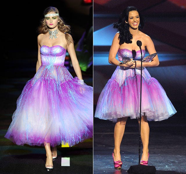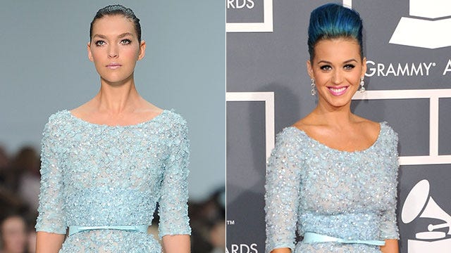 January 25, 2012 in France. Just a few weeks later, Katy Perry arrived in the Elie Saab creation to the 54th Annual Grammy Awards on February 12, 2012 in Los Angeles. Which style gives you the blues?