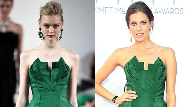 A model walks the runway in an emerald-green strapless gown during the Oscar de la Renta Resort 2013 runway show on May 21, 2012 in New York City. Girls star Allison Williams turned heads in the Oscar de la Renta frock at the 64th Annual Emmy Awards on September 23, 2012 in Los Angeles. Which green gown is the true gem?