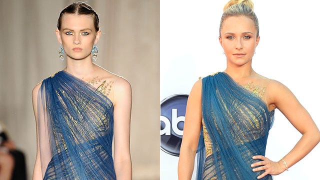 A model rocks the runway at the Marchesa Spring 2013 fashion show during Mercedes-Benz Fashion Week at Grand Central Station on September 12, 2012 in New York City. Less than two weeks later, Nashville's Hayden Panettiere takes to the 64th Annual Emmy Awards red carpet in the ethereal design on September 23, 2012. Which Grecian look is the food of the gods?