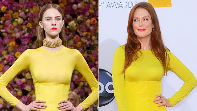 A model walks the runway in a yellow gown during the Christian Dior Haute-Couture show as part of Paris Fashion Week Fall/Winter 2013 on July 2, 2012 in France. Similarly, Julianne Moore wears the yellow Christian Dior design to the 64th Annual Emmy Awards on September 23, 2012. Which lady's yellow is anything but mellow?
