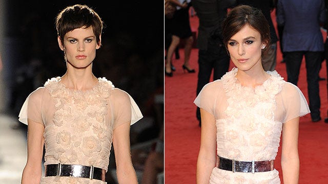 A model walks the runway at the Chanel Haute Couture show during Paris Fashion Week on July 3, 2012 in France. Similarly, Keira Knightley took to the red carpet in the Chanel design at the UK premiere of Anna Karenina on September 4, 2012 in London. Which ethereal style floats on?
