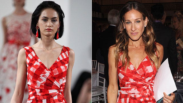 A model walks the runway in a red-and-white dress during the Oscar de la Renta Resort 2013 runway show on May 21, 2012 in New York City. Sarah Jessica Parker wears the the 2012 Couture Council for the Museum at