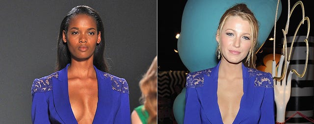 A model walks the runway in a cobalt blue suit at the Elie Saab Ready to Wear Spring / Summer 2012 show during Paris Fashion Week on October 5, 2011 in Paris. Similarly, Blake Lively wore the same suit to the Barneys New York Celebration Launch of Gaga's Workshop at Barneys New York on November 21, 2011 in New York City. Which suit sings the blues?