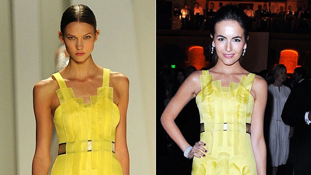 A model walks the runway at the Carolina Herrera Spring 2012 fashion show during Mercedes-Benz Fashion Week on September 12, 2011 in New York City. Camilla Belle wears the yellow design for The Art of Elysium's fifth annual Heaven gala at Union Station on January 14, 2012 in Los Angeles.