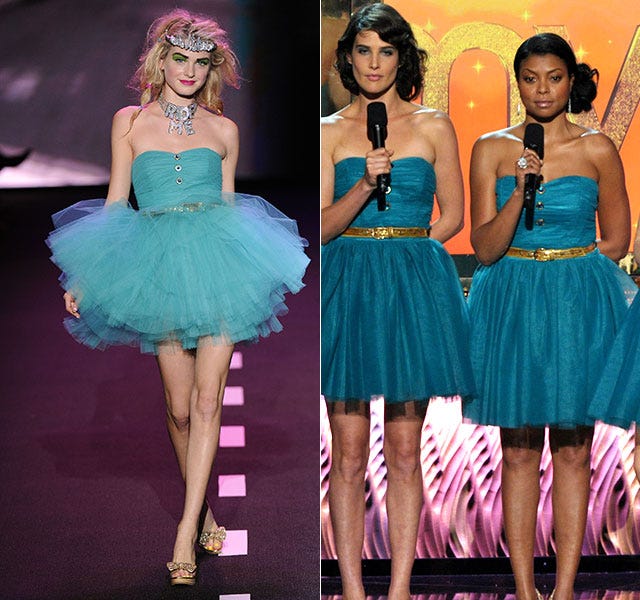 September 13, 2010 in New York City. Performing as Emmy Tones, Cobie Smulders and Taraji P. Henson sparkle in the same Betsey Johnson dress at the 63rd Annual Emmy Awards on Sept. 18, 2011. Which style do you prefer?