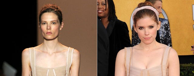 A model walks the runway at the Herve Leger by Max Azria Spring 2011 fashion show during Mercedes-Benz Fashion Week at Lincoln Center on September 14, 2010 in New York City. Kate Mara arrives in the flesh-colored Herve Leger dress at the 17th Annual Screen Actors Guild Awards on January 30, 2011 in Los Angeles. Which gets your vote?!