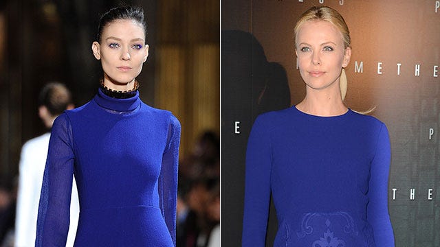 A model walks the runway during the Stella McCartney Ready-To-Wear show as part of Paris Fashion Week on March 5, 2012 in Paris, France. Charlize Theron wears a sleeker version of the Stella McCartney dress at the Prometheus Paris photocall on April 11, 2012 in France.