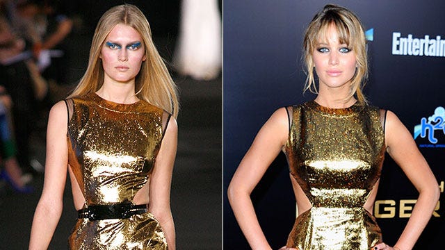 A model struts her stuff down the runway in a cut-out golden gown during the Prabal Gurung fall 2012 fashion show during Mercedes-Benz Fashion Week on February 11, 2012 in New York City. The "Girl on Fire," Jennifer Lawrence, caught everyone’s eye when she wore the same Prabal Garung gown to the premiere of The Hunger Games at Nokia Theatre L.A. Live on March 12, 2012 in Los Angeles. Which golden girl has the Midas touch?
