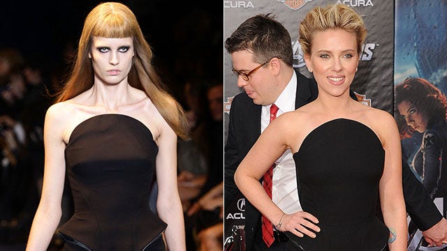 A a model wears a curve-necked dress to the Versace show during Milan Womenswear Fashion Week on February 24, 2012 in Italy. Scarlett Johansson took the style straight to the red carpet when she arrived at the premiere of The