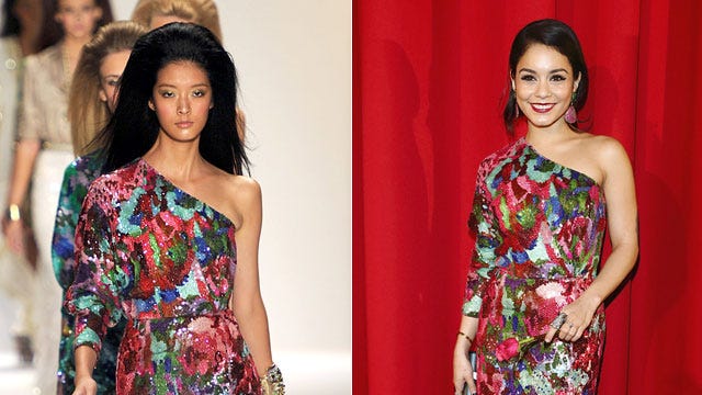 A model wears a colorful design from the Naeem Khan Spring 2011 collection, and now two years later, Vanessa Hudgens rocks the same daring dress at the Spring Breakers premiere in Berlin.