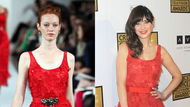 A model wears the red tulle design down the runway during the Oscar de la Renta Resort 2013 runway show on May 21, 2012 in New York City. "Adorkable" star Zooey Deschanel wears the rose-red Oscar de la Renta dress to Broadcast Television Journalists Association Second Annual Critics' Choice Awards on June 18, 2012 in Beverly Hills, California. Which dress makes everything come up roses?