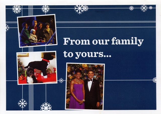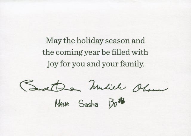 The season wouldn't be complete without the festive photos and messages attached to celebrity holiday cards. Click through to view the inside of the official White House card -- featuring the first family and their dog Bo -- as well as other star greetings!