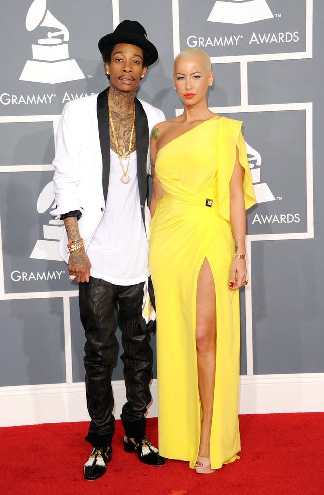 Wearing a white tuxedo jacket, rapper Wiz Khalifa and model Amber Rose arrive at the 54th Annual Grammy Awards on February 12, 2012 in Los