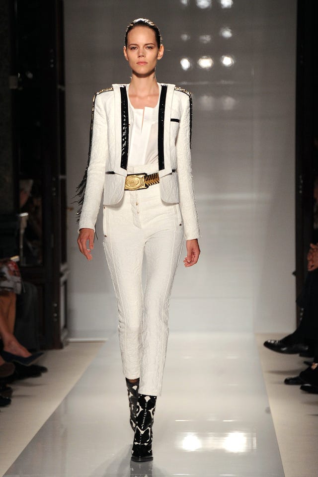 A model walks the runway in a fitted white tuxedo jacket during the Balmain Ready to Wear show during Paris Fashion Week on September 29, 2011 in Paris, France.