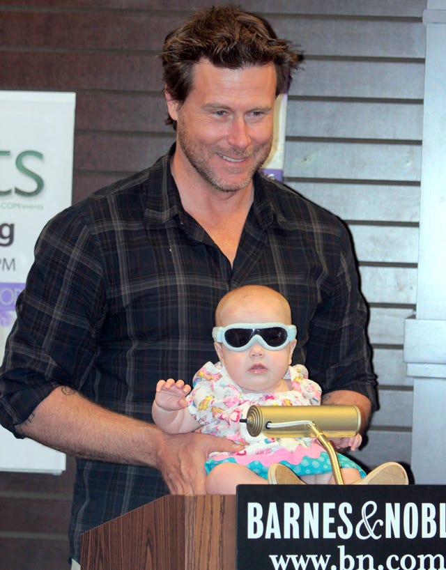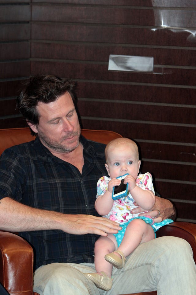 Little Hattie sits on her dad's lap, chewing on a phone at the book signing of her mom's new book CelebraTORI, at a Los Angeles Barnes & Noble.