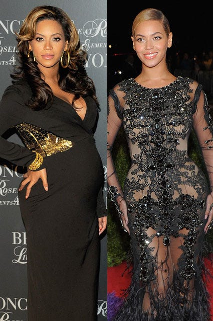 Beyonce flaunted her burgeoning belly in style at the screening of Live at Roseland: The Elements of 4 in New York City on November 20, 2011. Four months to the day after giving birth to daughter Blue Ivy, the new mom was back to her pre-baby curves on May 7, 2012 MET Costume Institute Gala in NYC.