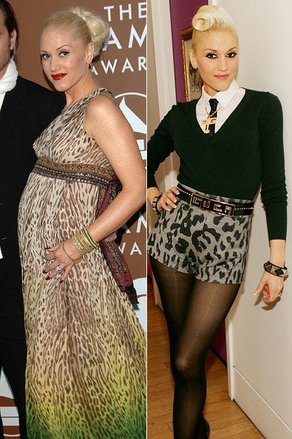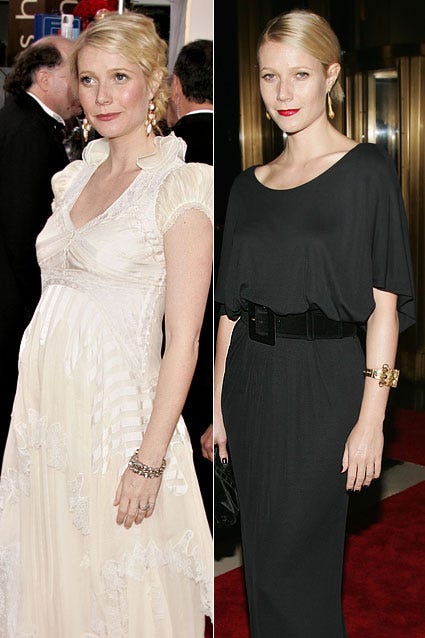 Gwyneth Paltrow showed off her telltale tummy (pregnant with baby Moses) at the Golden Globes on January 16, 2006. In October, the actress left no trace of her once rounded belly as she posed for photos at The Fashion Group International's Night of Stars in New York City.