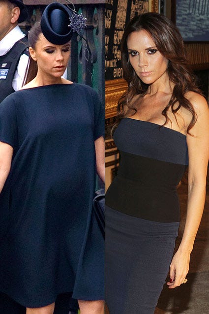 Victoria Beckham and her baby bump arrived to Westminster Abbey for the wedding of Prince William and Kate Middleton in London on April 29, 2011. Less than seven months later, Beckham was back to her notoriously thin self when she hit the red carpet for the WWD Apparel & Retail CEO Summit in New York City.
