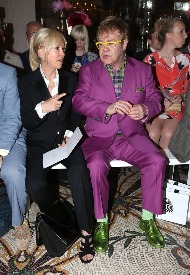 All eyes were on Sir Elton John with his purple suit, plaid shirt and green spectators sits in the front row for Richard James spring/summer '13
