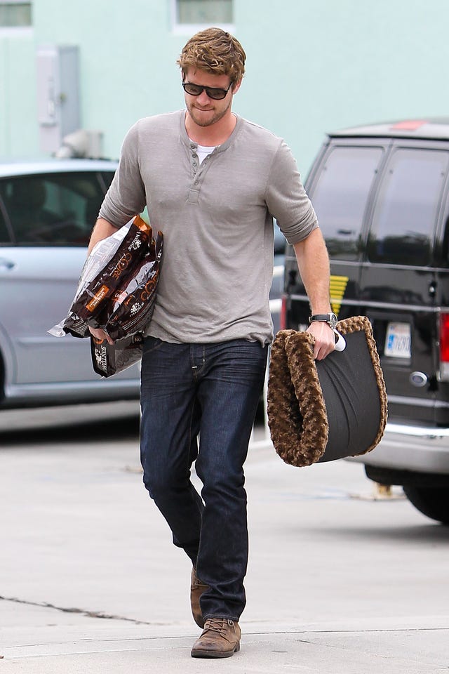 Miley Cyrus' main squeeze Liam Hemsworth picks up some chow for his pooch, along with what appears to be a pet bed, in Studio City, Calif. on May 1.