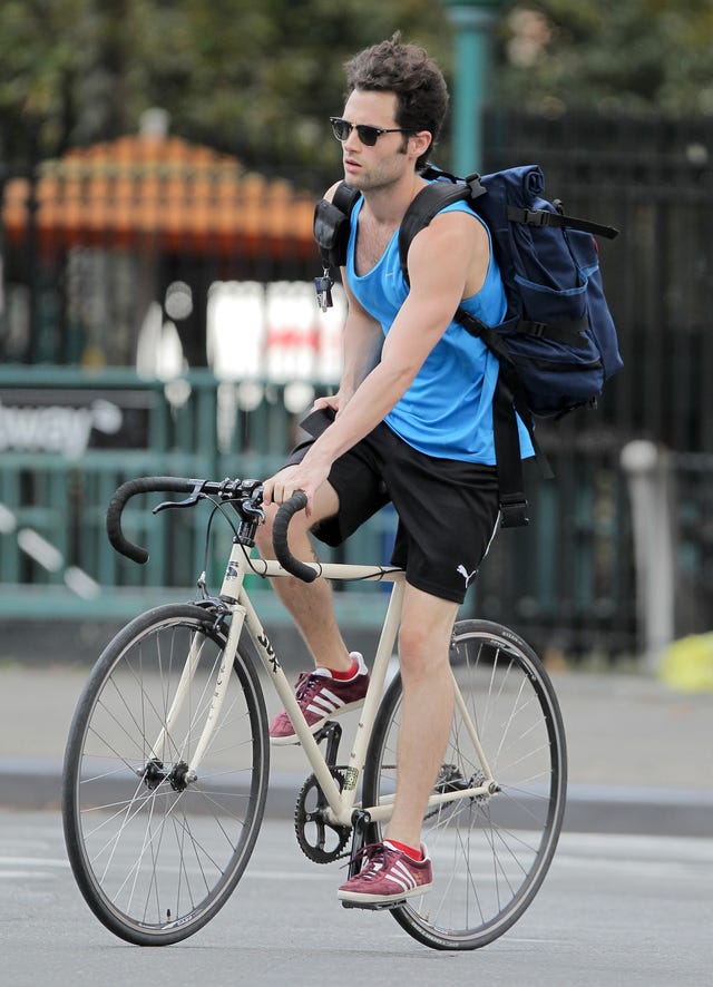 Penn Badgley opts for a humble mode of transportation, riding a bicycle around Manhattan on August 13.