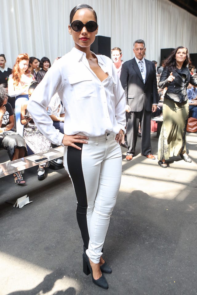 Alicia Keys wears a black-and-white look at the Edun Spring 2013 at Skylight at Moynihan Station on September 8, 2012 in New York City.