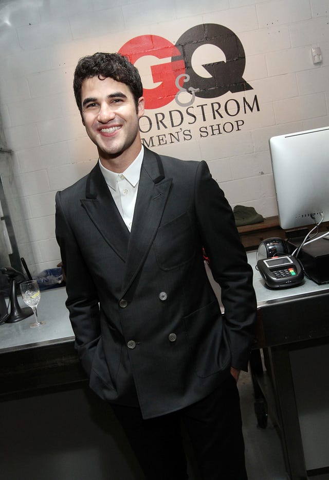 Darren Criss wears a double-breasted suit to the GQ & Nordstrom pop-up store event during