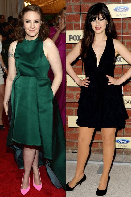 Best Comedy Actress nominee Lena Dunham as Hannah Horvath in Girls vs. Best Comedy Actress nominee Zooey Deschanel as Jess Day in New Girl