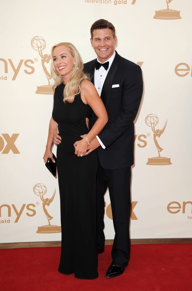 Bones star David Boreanaz and his wife Jaime Bergman are all smiles as they arrive at the 63rd annual Primetime Emmy Awards at the Nokia Theatre in downtown Los Angeles on September 18, 2011.