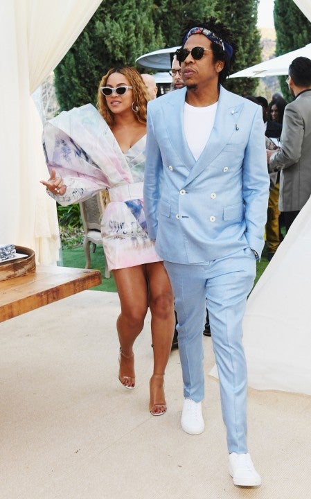 The "Love on Top" songstress and her rapper husband arrived in color-coordinated pastel looks to the 2019 Roc Nation "THE BRUNCH" pre-GRAMMYs party in Los Angeles on Feb. 9. Bey showed off her curves in a white, asymmetrical mini dress that featured splashes of pastel hues and a dramatic sleeve, completing the look with clear single-strap heels, light blue sunglasses and diamond hoop earrings. Jay looked equally chic in a custom FRÈRE baby blue double-breasted suit, white tee and sneakers. He finished his look by adding a navy printed scarf around his head and dark Ray-Ban sunglasses.