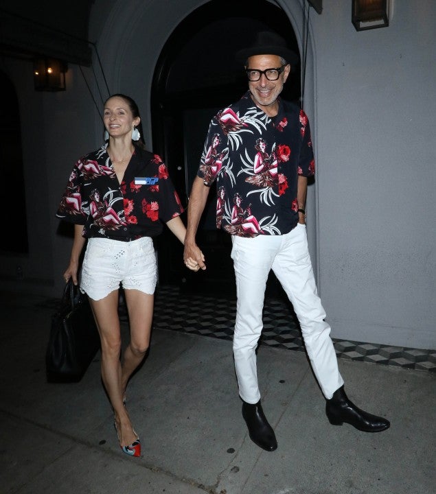 The duo rocked matching black Hawaiian shirts with white bottoms -- denim shorts for Livingston and skinny jeans for Goldblum -- during a night out in Los Angeles on June 22.