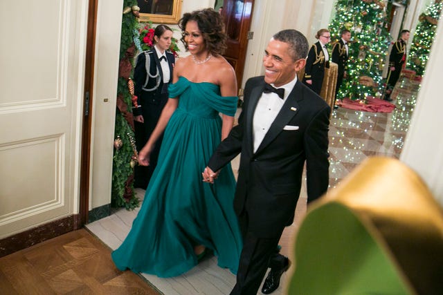 The Obamas were beaming as they arrived at a White House reception for the 2013 Kennedy Center Honorees in December 2013.