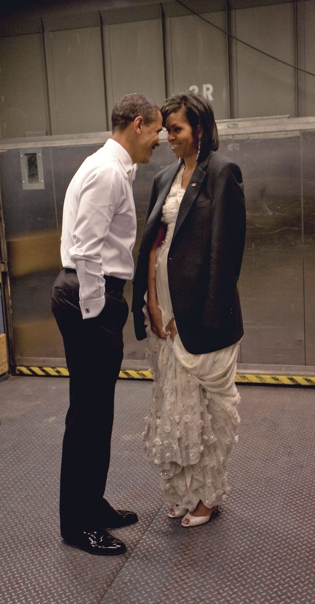The lovebirds shared a sweet moment as they waited in the freight elevator prior to their grand entrance for the Neighborhood Inaugural Ball, one of 10 inaugural balls held for the new president in January 2009. Michelle was even wearing Barack's jacket to keep warm as he leaned in to gently touch her forehead with his. Aw!