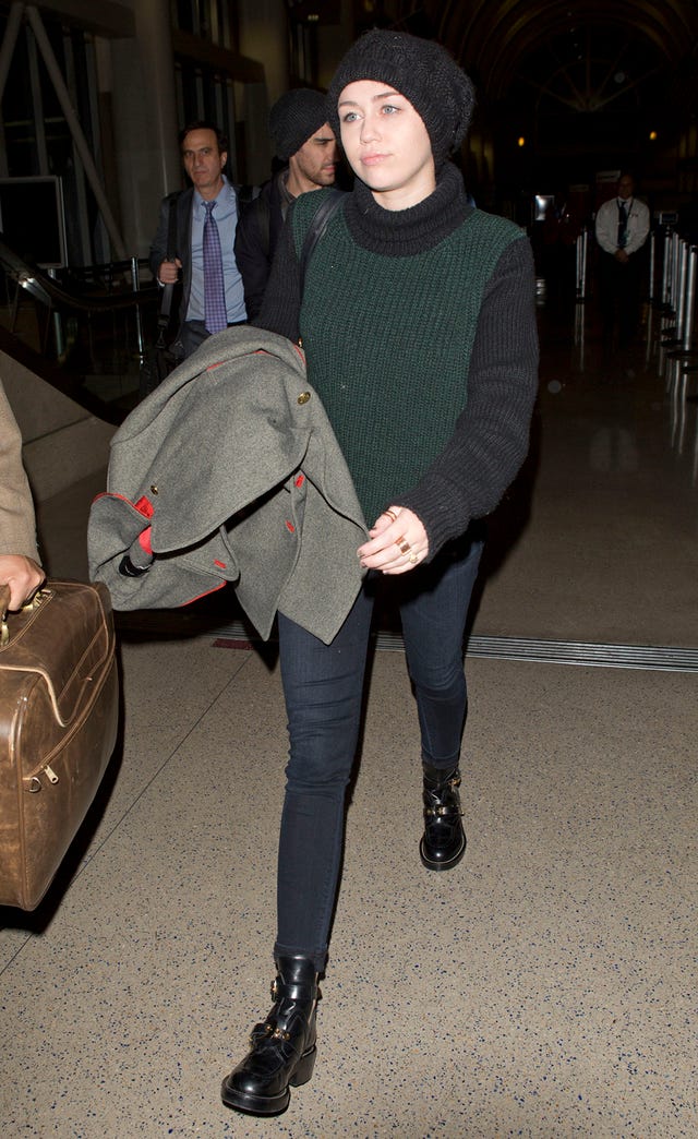 Is Miley Cyrus' borrowed from the boys outfit hipster chic, or are the dark colors a little too bleak?