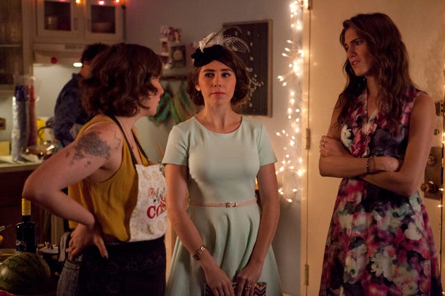 Here, Hannah (Lena Dunham), Shoshanna (Zosia Mamet) and Marnie (Allison Williams) catch up at Hannah and Elijah's (Andrew Rannells) housewarming party in the first episode back, titled It's About Time.