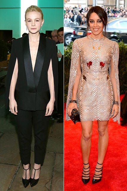 Carey Mulligan rocked this unconventional black tuxedo jacket by Victoria Beckham at the Tiffany & Co. Blue Book Ball in New York City on April 18, 2013 -- a look Aubrey Plaza sported at the 2013 Met Gala with this reptile-print Marios Schwab dress.