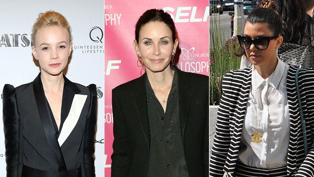 Menswear-inspired clothing is making a big comeback. Celebs like Carey Mulligan, Courteney Cox, and Kourtney Kardashian have all been rocking the pantsuits both on and off the red carpet. At a recent screening of The Great Gatsby, Carey Mulligan looked polished in a black-and-white Lanvin pantsuit and black Brian Atwood heels. Courteney Cox kept it simple and sophisticated in a black pantsuit, which she paired with a black-and-white polka dot blouse at a recent book opening in West Hollywood. Another star getting her pantsuit on is Kourtney Kardashian. She stepped out in Beverly Hills in a black-and-white striped killer shorts suit. She accessorized with a sleek Celine Trio Bag. Between the pants and the shorts suits, these trendy looks are definitely going to catch on soon!
