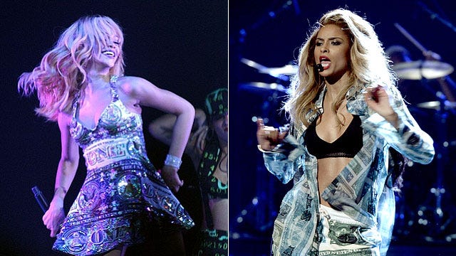 Money talks! Though Rihanna and Ciara are not exactly on the friendliest terms, they do share a wild sense of style. Rihanna was first to sport this money-print dress on her Diamonds world tour, while Ciara showed off her killer abs in her own dollar bill-inspired ensemble performing at the 2013 BET Awards.