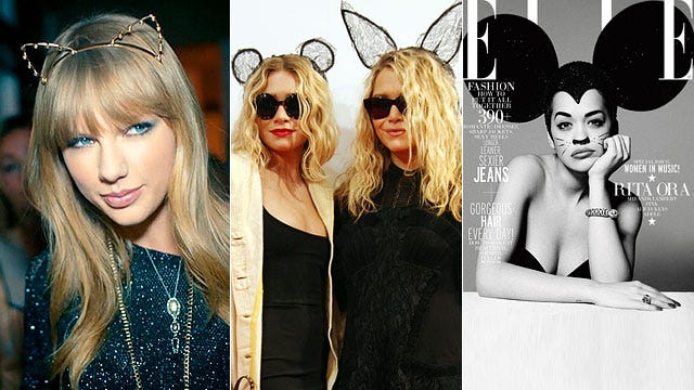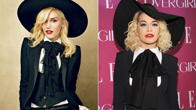 Big bow ties seem to be a big trend in Hollywood lately, but Rita Ora and Gwen Stefani took it a step further by adding even bigger hats. Stefani wore the trend for the Feb. issue of Vogue magazine, while Ora, dressed in a very similar black and white getup, showed up with a hat on head and tie on neck for the 4th Annual ELLE Women in Music Celebration on April 11, 2013.
