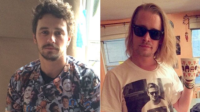 Apparently, sporting a t-shirt with your own face on it is becoming a new trend in Hollywood! Macaulay Culkin made waves with his band The Pizza Underground’s Twitter on May 11, 2014 with this major meta moment, wearing a t-shirt of Ryan Gosling wearing a t-shirt of himself in his child star days. James Franco on the other hand, took the trend more literally, sporting this shirt featuring pictures of himself playing his various roles throughout his career. "Weird shirt," he posted on Instagram on May 9.