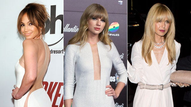 Thursday night, Jan. 24, 2013, saw three fashionistas donning similar white styles across the globe. Jennifer Lopez nearly bared her butt in her Kaufman Franco dress at a Las Vegas screening of Parker. Meanwhile, Taylor Swift also stepped out in a white Kaufman Franco dress with a serious plummeting neckline upon accepting an honor at the 40 Principales Awards in Madrid, Spain. Then there was Rachel Zoe, who was spotted in a floor-length white getup as she arrived to the Chateau Marmont Hotel in West Hollywood, Calif.