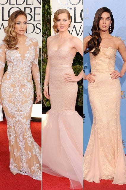 Jennifer Lopez, Megan Fox, Hayden Panettiere and Amy Adams led the trend of nude gowns at the 2013 Golden Globes. Pale fishtails were also a popular look on the red carpet.