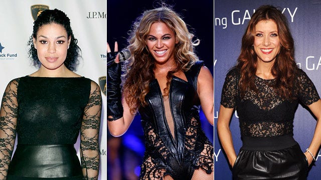 Leather and lace was the celebrity favorite combination Super Bowl weekend, as Jordin Sparks, Beyonce and Kate Walsh were all spotted sporting the sweet and sassy trend! Jordin wore a lace Bailey dress, accentuated with a leather peplum at the Giving Back Fund's 2013 Big Game Big Give Super Bowl Celebration Saturday, while Beyonce rocked a daring skin-tight leather and lace leotard by her costume designer Rubin Singer for her highly anticipated Halftime performance. Walsh rounded out the three in a lace Dolce & Gabbana top and a leather Jenni Kayne skirt at the Samsung Galaxy Shangri-La Party Saturday.