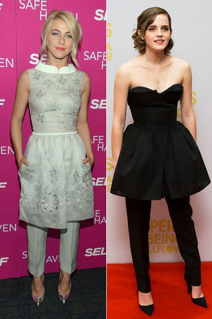 Julianne Hough brought back a '90s style with her George Hobeika dress-over-pants ensemble at the Safe Haven premiere in New York City on February 11, 2013, but she isn't the first star to revive the comfy look. Emma Watson sported the same style -- hers a black Christian Dior Couture layered creation -- at a London screening of The Perks of Being a Wallflower on September 26, 2012.