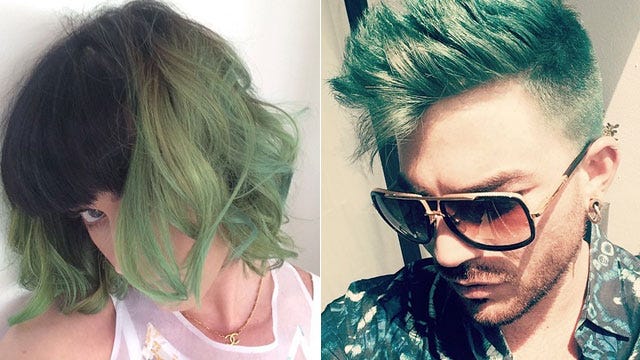 Green hair is the celeb hair color for spring! Katy Perry debuted her daring 'do on April 7, 2014, calling the color "slime green," while Adam Lambert showed off his green locks on Instagram on April 14, writing, "Green Hair Don't Care."