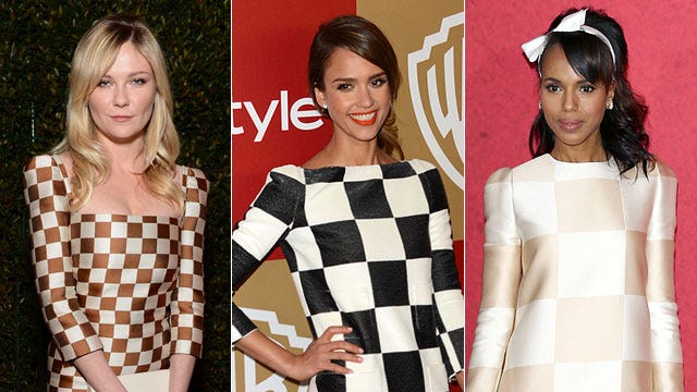 Fashionable ladies Kirsten Dunst, Jessica Alba and Kerry Washington all appear to be taken with Louis Vuitton's bold checkerboard print! Kirsten is the latest star to pull off the loud style, wearing her floor-length Vuitton at Art of Elysium's "Heaven" gala on January 12 in Los Angeles, while Jessica sported hers at InStyle's Golden Globes after party Sunday night. Previously, Kerry stunned in the cream-colored version of the dress at the Django Unchained photo call in Berlin on January 8.